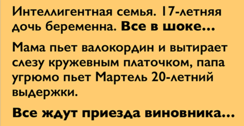 Мама пьет валокордин и вытирает слезу кружевным платочком, папа угрюмо пьет Мартель двадцатилетней выдержки. Все ждут приезда виновника.