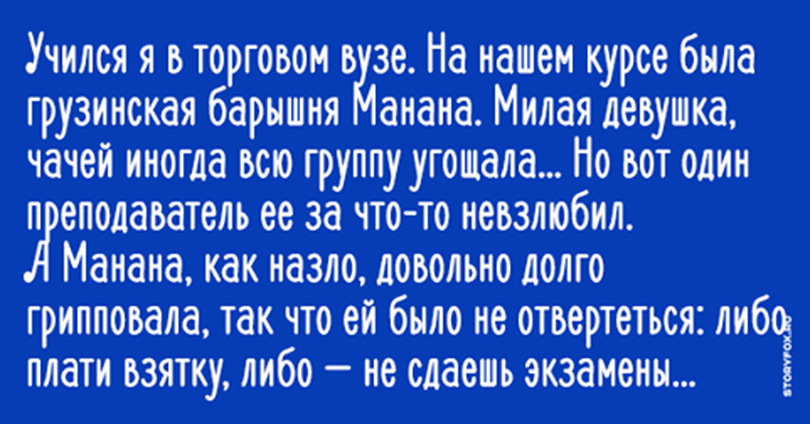 Учился я в торговом вузе. Hа нашем курсе была грузинская барышня Манана. Милая девушка, чачей иногда всю группу угощала… Hо вот один преподаватель ее за что-то невзлюбил.