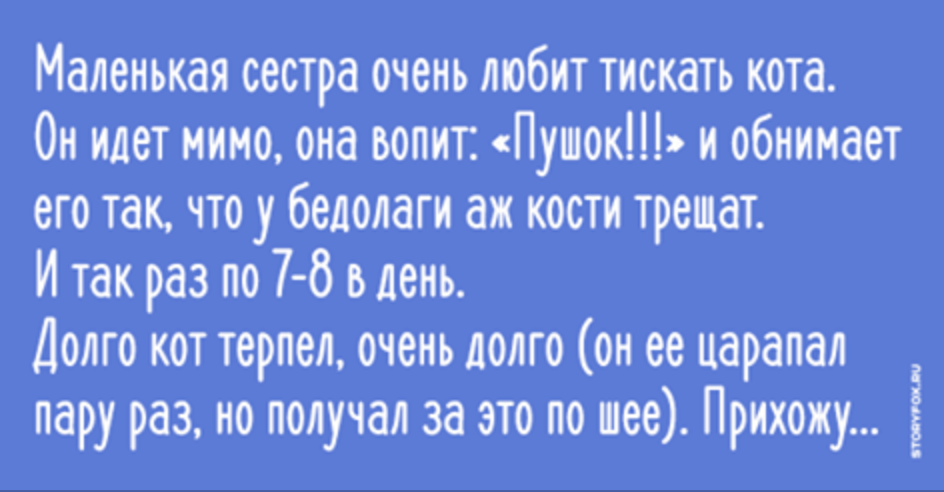 Я уж подумал, что сестра ему мозг окончательно расплющила. В комнату заходит младшая. Ну, все как обычно, «Пушочек !!!» и бегом к нему. Кот, который обычно старается спастись бегством, ни с места.