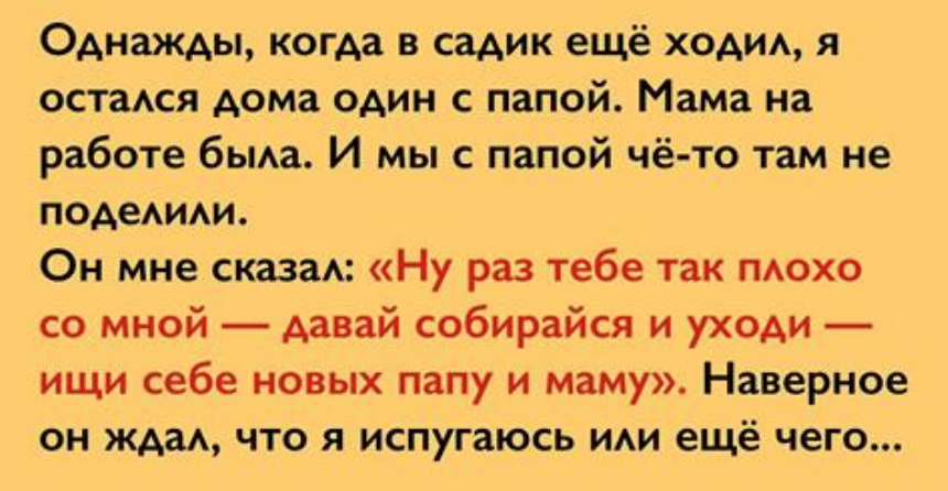 Он мне сказал: «Ну раз тебе так плохо со мной — давай собирайся и уходи — ищи себе новых папу и маму». Наверное он ждал, что я испугаюсь или ещё чего.