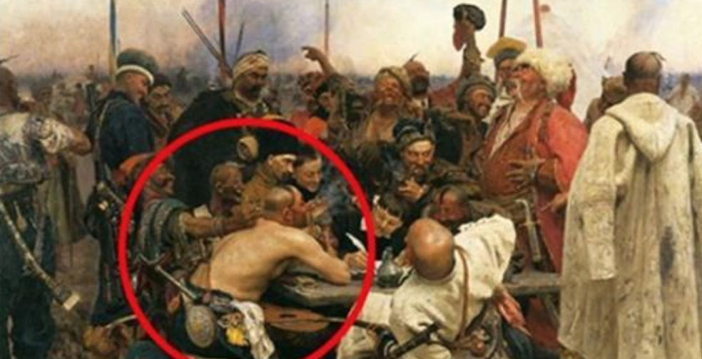 Ну что, поняли уже, почему этот запорожец, единственный среди всех, изображен без рубашки? Тогда сверяйте свой ответ с правильным.