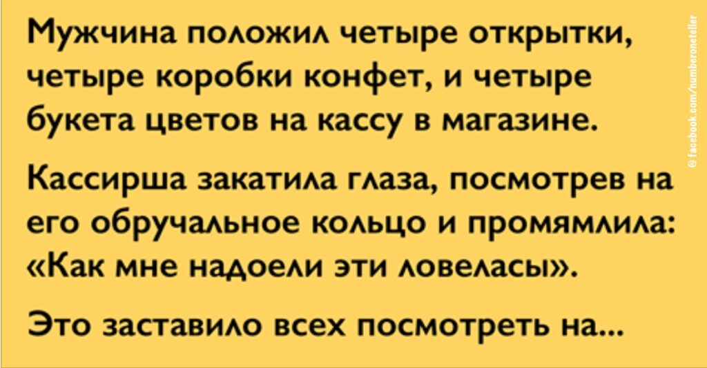 Кассирша закатила глаза, посмотрев на его обручальное кольцо и промямлила: «Как мне надоели эти ловеласы».