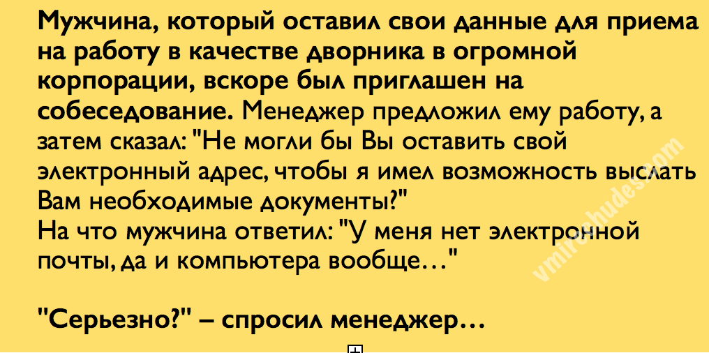 Мужчина, который оставил свои данные для приема на работу в качестве дворника в огромной корпорации, вскоре был приглашен на собеседование. Менеджер предложил ему работу, а затем сказал: «Не могли бы Вы оставить свой электронный адрес, чтобы я имел возможность выслать Вам необходимые документы?»