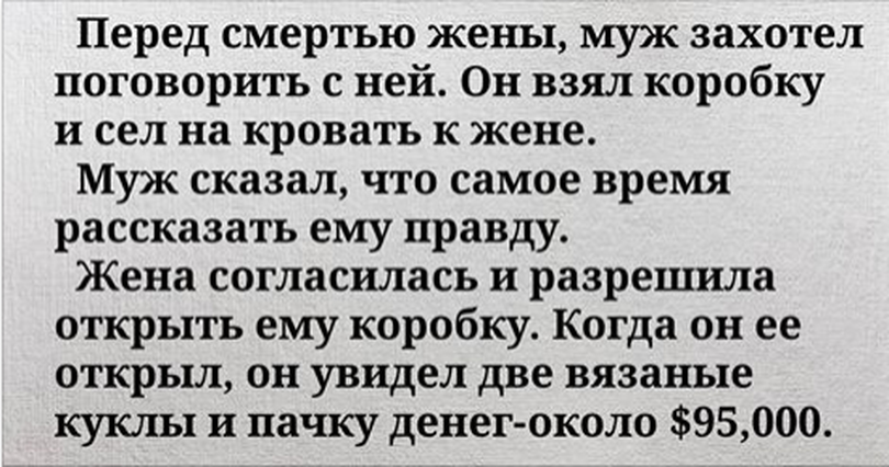 Перед смертью жены, муж захотел поговорить с ней. Он взял коробку и сел на кровать к жене. Муж сказал, что самое время рассказать ему правду. Жена согласилась и разрешила открыть ему коробку. Когда он ее открыл, он увидел две вязаные куклы и пачку денег-около $95,000. Мужу было очень интересно узнать, откуда все это.