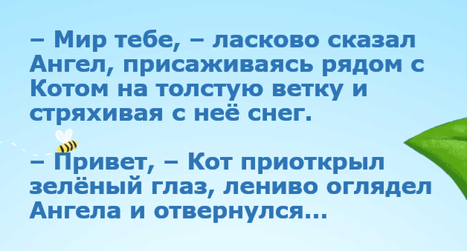 – Привет, – Кот приоткрыл зелёный глаз, лениво оглядел Ангела и отвернулся.