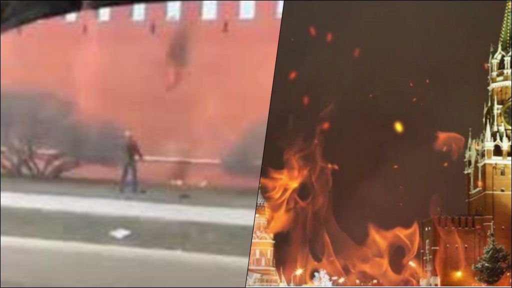Місця на цегляній стіні Кремля, куди потрапила запальна суміш, почорніли.