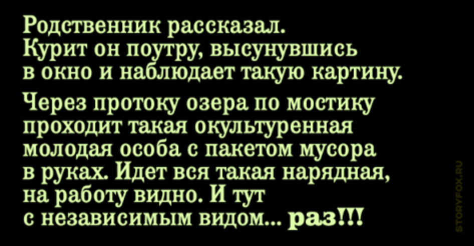 А в это время за ней в шагах 10 шел дядечка, тоже такой невозмутимый, на работу похоже тоже топал. Так вот, дядечка не меняясь в лице, подобрал этот пакет с мусором, невозмутимо включив повышенную передачу, поровнялся с тетенькой… и на ходу высыпал все содержимое ей на голову… и далее также невозмутимо пошел восвояси.