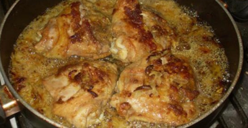 Сдвинуть лук к краям сковороды, а в середину выложить куски курицы. Обжарить их с обеих сторон по 6-7 минут. Затем нужно влить пиво и потушить курицу под крышкой еще минут 10-15. Подавать нашу курочку будем прямо в сковородке. Очень вкусно ее есть, обмакивая при этом хлеб в соус — он просто бесподобен.