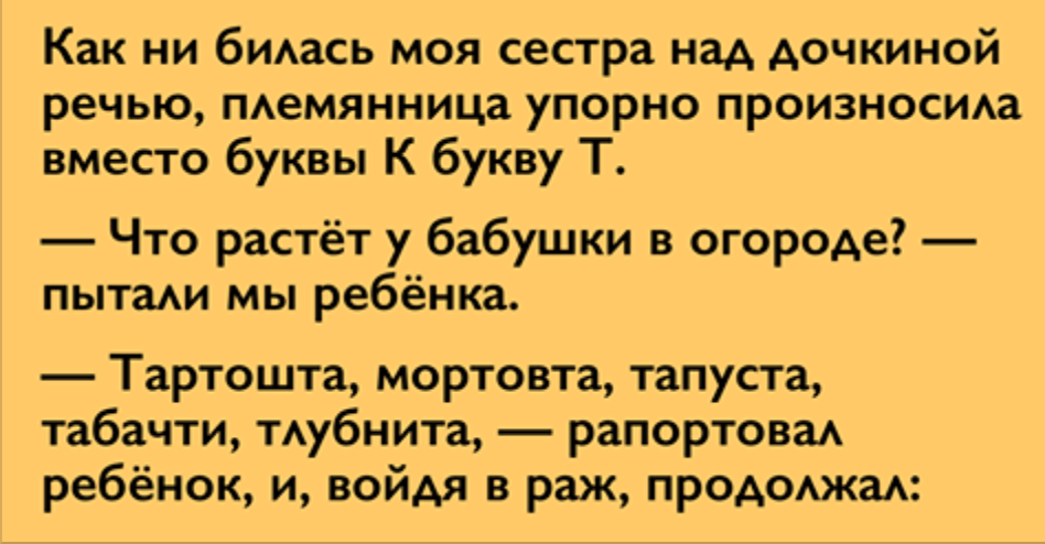 — Тартошта, мортовта, тапуста, табачти, тлубнита, — рапортовал ребёнок, и, войдя в раж, продолжал: — бананы…