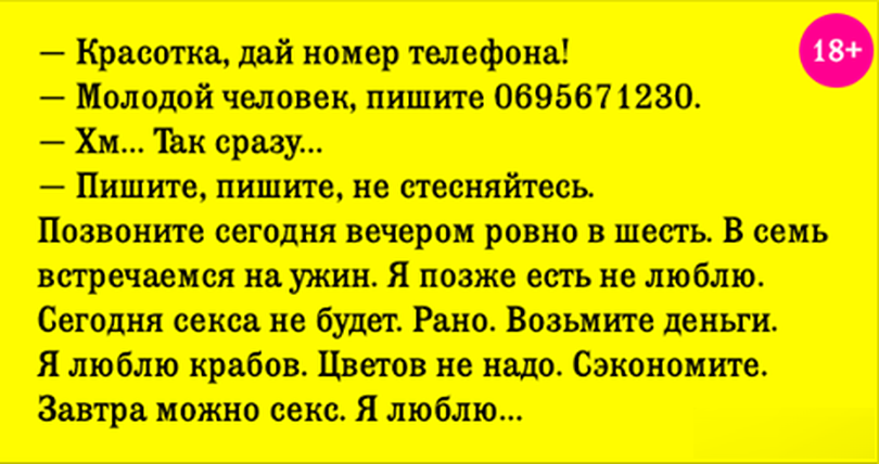 — Пишите, пишите, не стесняйтесь. Позвоните сегодня вечером ровно в шесть. В семь встречаемся на ужин. Я позже есть не люблю. Сегодня с@кса не будет. Рано. Возьмите деньги. Я люблю крабов. Цветов не надо. Сэкономите.
