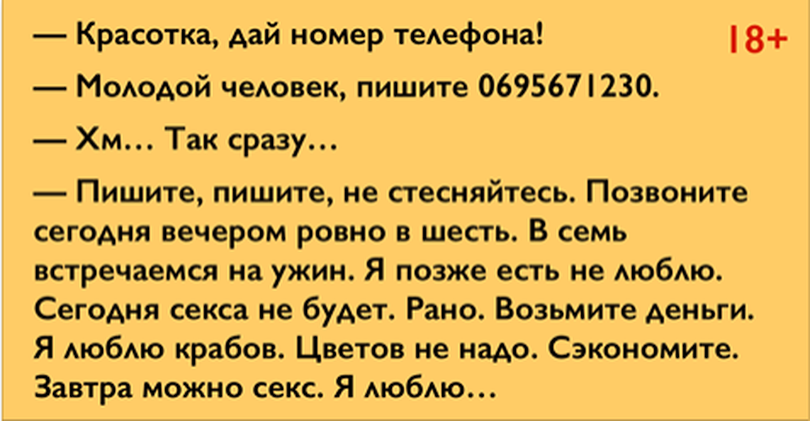 — Пишите, пишите, не стесняйтесь. Позвоните сегодня вечером ровно в шесть. В семь встречаемся на ужин. Я позже есть не люблю. Сегодня с@кса не будет. Рано. Возьмите деньги. Я люблю крабов. Цветов не надо. Сэкономите.