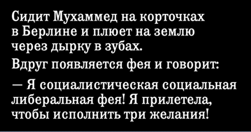 Cидит Мухаммед на корточках в Берлине и плюет на землю через дырку в зубах. Вдруг появляется фея и говорит…
