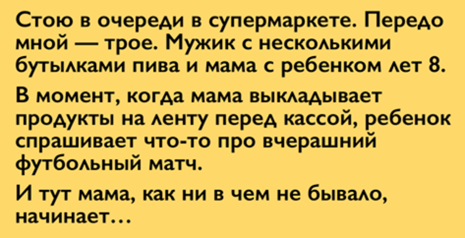 В момент, когда мама находится в процессе выкладывания продуктов на ленту перед кассой, ребенок — мальчик лет 8 — спрашивает что-то про вчерашний футбольный матч.
