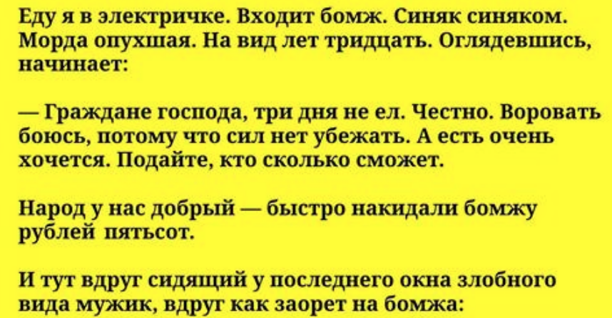 — Эй, стой! — вскакивает мужик и с деньгами в руках выбегает за бомжом в тамбур.