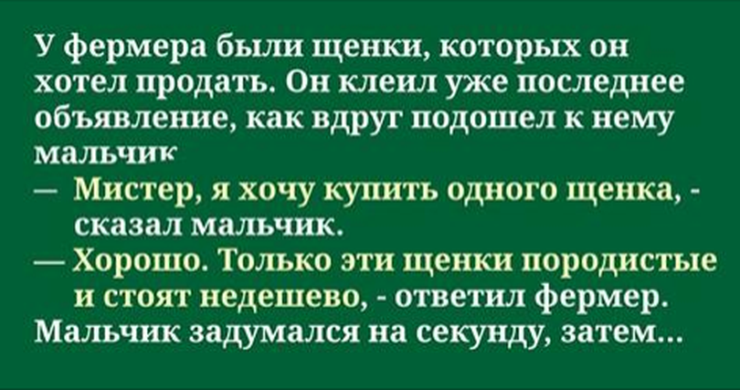 У фермера были щенки, которых он хотел продать. Он клеил уже последнее объявление, как вдруг подошел к нему мальчик.