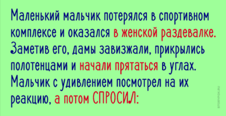 6. Девочка наблюдала за тем, как ее родители собираются на посиделки с друзьями. Когда она увидела, как папа надевает свои лучшие брюки и рубашку, она сказала: «Папа, тебе не стоит это надевать». «Почему, солнышко?». «Ты же знаешь, что у тебя после этого всегда на следующее утро болит голова».