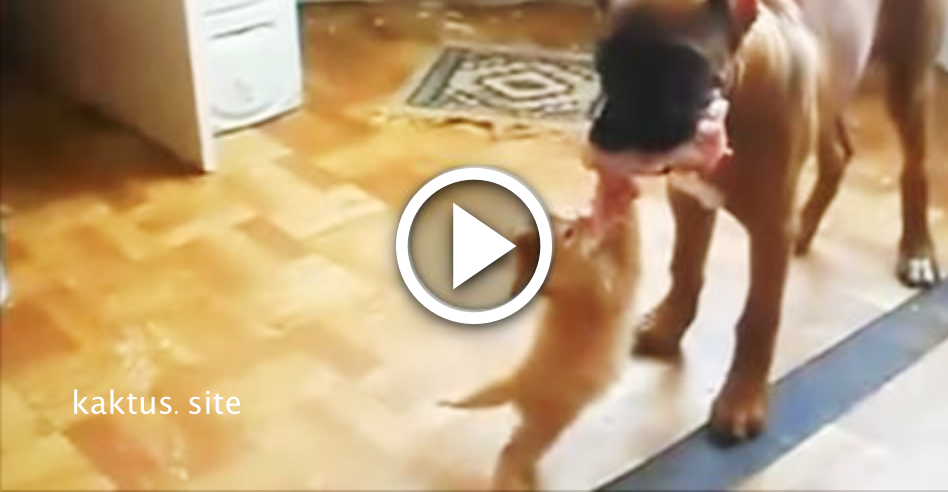Как котенок ни старался, но одолеть такого оппонента, превосходящего его в величине и силе во много раз, шансов у него не было. В конце концов юный смельчак расцепил челюсти, а в этот момент собака тут же убежала с мясом в сторону.