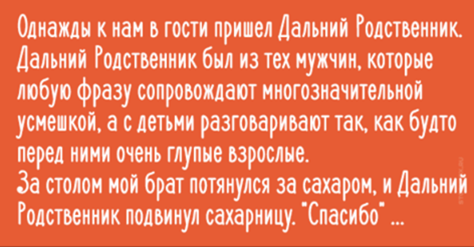 Дальний Родственник был из тех мужчин, которые любую фразу сопровождают многозначительной усмешкой, а с детьми разговаривают так, как будто перед ними очень глупые взрослые.