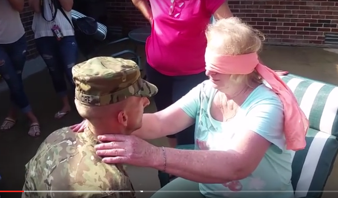 Женщине повязали на глаза повязку. Ее задачей было узнать, кто перед ней стоит, ощупывая каждого. Один за другим члены семьи подходили и наклонялись к ней. В этом время на заднем плане появляется человек в униформе — это Райан. Он подошел к маме, опустился на колени. Как только женщина положила ему руки на плечи, было видно, что она уже о чем-то догадалась. Когда же она потрогала его лицо, все, кто был рядом, расплакались. Но больше всех плакала, конечно же, мама.
