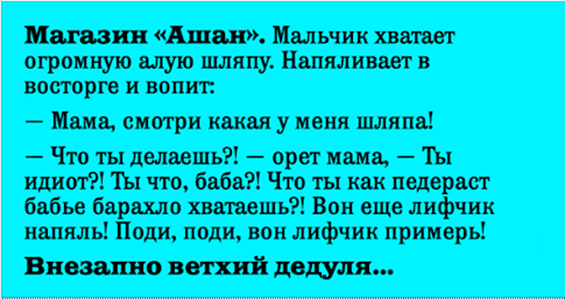 — Что ты делаешь?! — орет мама, — Что ты женскую шляпу схватил? Ты идиот?! Ты что, баба?! Ты бы еще трусы женские напялил! Что ты как педераст бабье барахло хватаешь?! Вон еще лифчик напяль! Поди, поди, вон лифчик примерь!