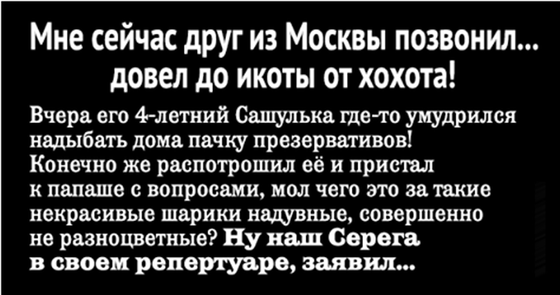 Вчера его 4-летний Сашулька где-то умудрился надыбать дома пачку презерв@тивов! Конечно же распотрошил её и пристал к папаше с вопросами, мол чего это за такие некрасивые шарики надувные, совершенно не разноцветные? Ну наш Серега в своем репертуаре, заявил мне сегодня, что не хочет растить дауна и решил рассказать ребенку (в 4 года!) всю правду об этих «шариках надувных»… при этом еще и показать как и куда они надеваются… Слава богу, что догадался показывать не на себе, а на сыне! Сын был в полном восторге от такой увлекательной игры, только его дико расстраивало, что они с него сваливаются… Папаша не растерялся и объяснил отпрыску, типа вот когда они с тебя перестанут сваливаться тогда и можно будет с девочками целоваться…