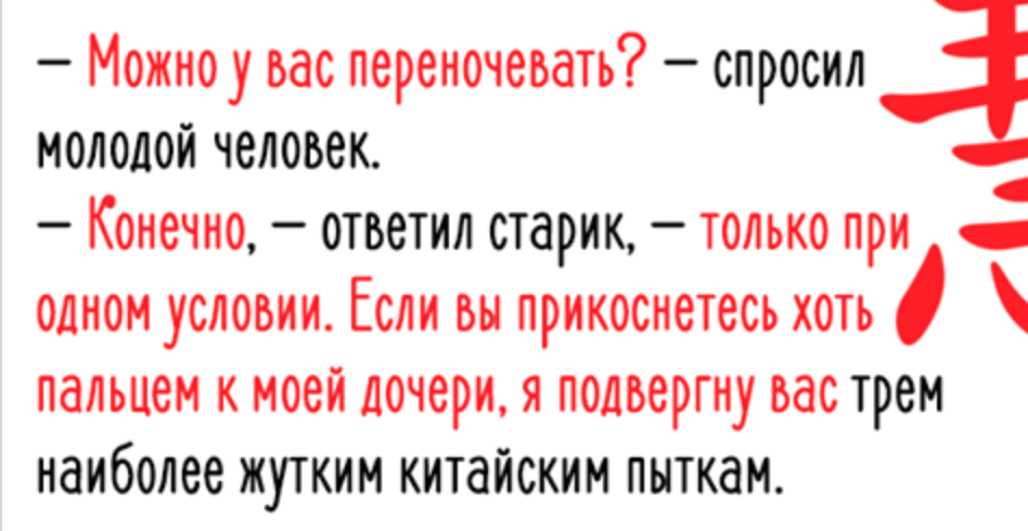 – Конечно, – ответил старик, – только при одном условии. Если вы прикоснетесь хоть пальцем к моей дочери, я подвергну вас трем наиболее жутким китайским пыткам.