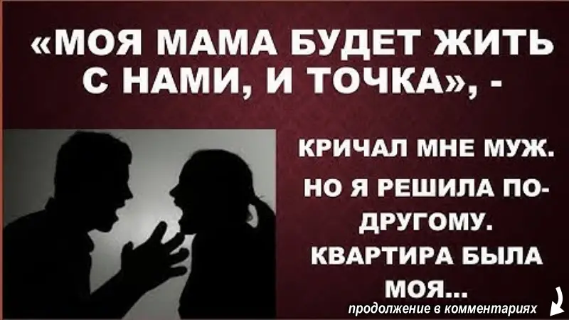 «Моя мама житиме разом з нами», — повідомив чоловік, але поселити він збирався її в мою квартиру FA 2 года назад «Моя мама житиме разом з нами», — повідомив чоловік, але поселити він збирався її в мою квартиру …