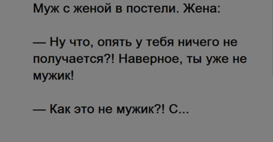 Муж с женой в постели. Жена: В мире Чудес 8 лет назад Муж с женой в постели. Жена: — Ну что, опять у тебя ничего не получается?! Наверное, ты уже не мужик! — Как это не мужик?! С другими—то получается!