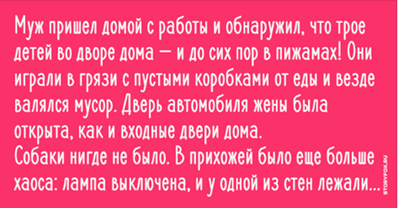 Муж поспешил вверх по лестнице, шагая через игрушки и груды одежды в поисках свой жены. Он боялся, что она заболела или что-то случилось серьезное. Он увидел на полу воду, которая вытекала из двери ванной.