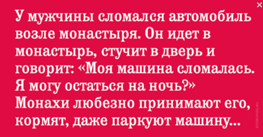 У мужчины сломался автомобиль возле монастыря. Он идет в монастырь, стучит в дверь и говорит: «Моя машина сломалась. Я могу остаться на ночь?»