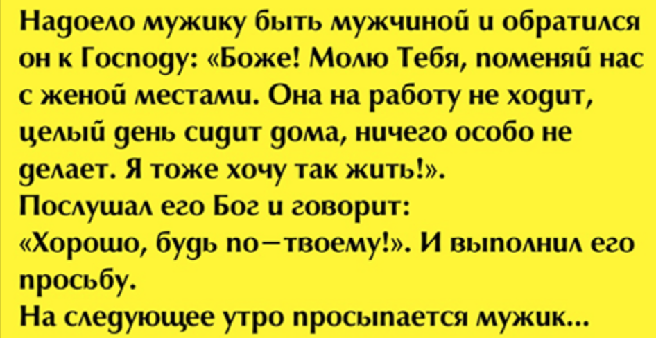 Но сильный пол на то и сильный, чтобы преодолевать трудности. Однако этому мужчине очень надоело так жить. Вот и обратился к Господу: «Боже! Молю Тебя, поменяй нас с женой местами. Она на работу не ходит, целый день сидит дома, ничего особо не делает. Я тоже хочу так жить!». Послушал его Бог и говорит: «Хорошо, будь по-твоему!».