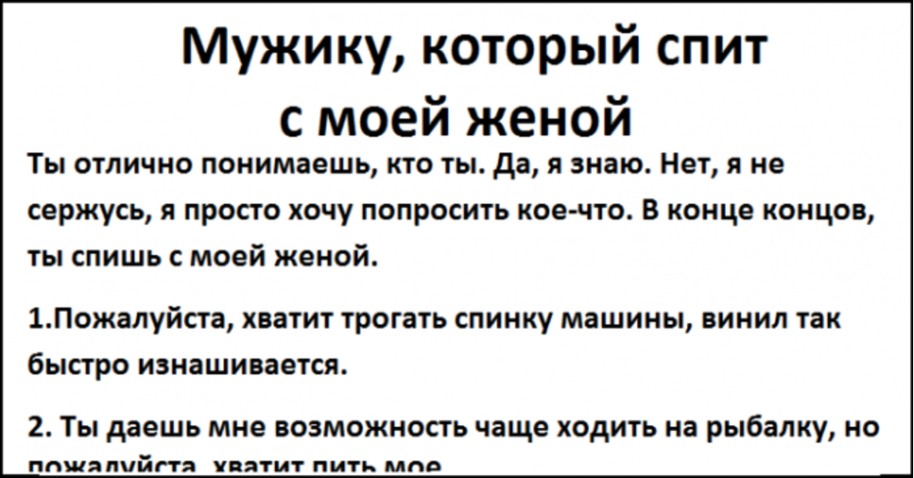 «Мужику, который спит с моей женой. Ты отлично понимаешь, кто ты. Да, я знаю. Нет, я не сержусь, я просто хочу попросить кое-что. В конце концов, ты спишь с моей женой.