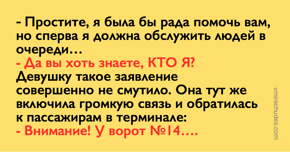 Даже не дрогнув, находчивая служащая улыбнулась и сказала: «Сожалею, сэр, но для этого вам тоже придется встать в очередь!». После этих слов терминал разразился истерическим хохотом, а покрасневший нахал поспешно удалился.