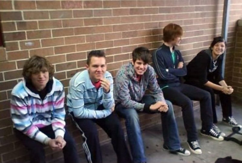 Что ж, как мы уже говорили, эти подростки гуляют во дворе, смеются и болтают, сидя на скамейке. Кстати, насчет скамейки, где она? Наверняка вы сразу и не заметили, что на фотографии ее нет, а парни просто делают вид, что сидят. Вероятно, им пришлось довольно долго пробыть в таких неудобных позах, чтобы получилась эта фотография. По крайней мере, их старания были не напрасны.