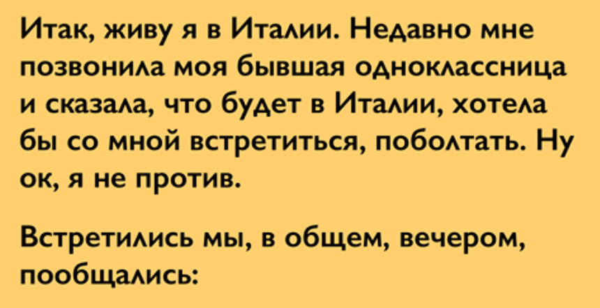 Итак, живу я в Италии. Недавно мне позвонила моя бывшая одноклассница и сказала, что будет в Италии на каникулах, хотела бы со мной встретиться — поболтать.