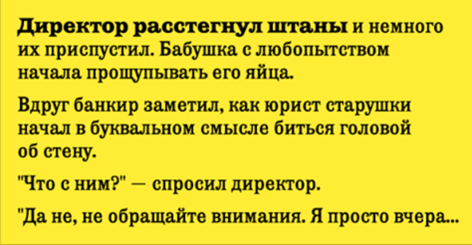 Директор расстегнул штаны и немного их приспустил. Бабушка с любопытством начала прощупывать его яйца. Вдруг банкир заметил, как юрист старушки начал в буквальном смысле биться головой об стену. «Что с ним?» — спросил директор.