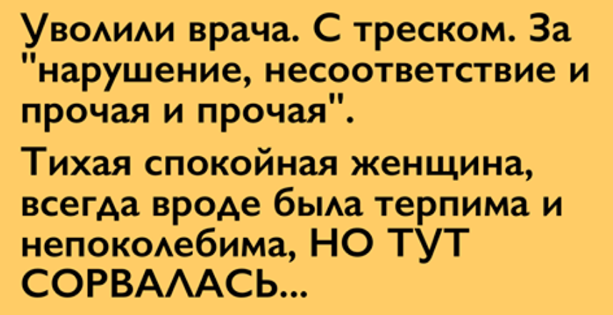 Уволили врача. С треском. За «нарушение, несоответствие и прочая, и прочая». Тихая спокойная женщина, всегда вроде была терпима и непоколебима, но тут сорвалась.
