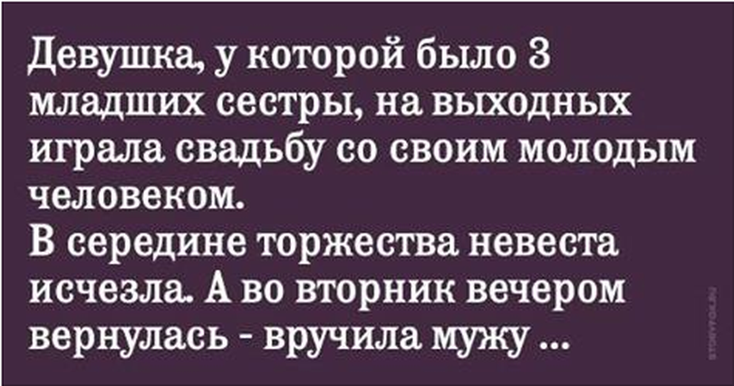 Оказалось, что на банкете ей стало нехорошо и она вышла на воздух. Там услышала, как ее папа рассказывал жениху о том, что женился на маме невесты «по залёту». Как он жалеет об этом всю свою жизнь, как он несчастлив, ведь он любил и любит до сих пор какую-то Свету, как он сочувствует и понимает зятя, который оказался в такой же ситуации, и ещё отпустил шутку, что одна девушка умудрилась одинаково сломать жизнь двум разным мужчинам. И они оба смеялись.