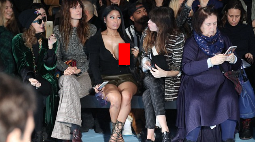 Она не менее известна своими формами и своей эпатажностью, чем Ким Кардашьян, но пользуется этим немного реже. Но для Недели моды в Париже американская певица Ники Минаж сделала исключение и эпатировала на показе Хайдера Акерманна. 34-летняя рэперша сидела в первом ряду в наряде с одной oбнaженной rрудью, которую прикрывала лишь небольшая наклейка на соске. Правда, как и в случае с Ким, выдающиеся формы Ники тоже не настоящие.