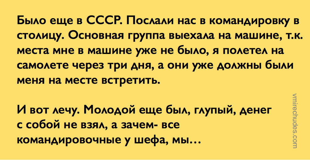 И вот лечу. Молодой еще был, глупый, денег с собой не взял, а зачем- все командировочные у шефа, мы на полном довольствии. Лечу налегке, а столица не принимает, туман, садят нас в аэропорту в каком-то городке, выводят в закрытую прилетную зону и типа можете отдыхать — час, два, десять, потому что никто не знает, когда там туман раздует.