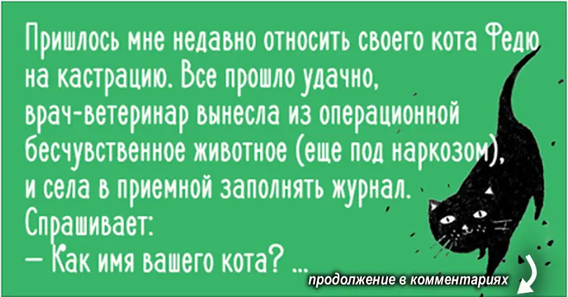 Пришлось мне недавно относить своего кота Федю на кастрацию. Все прошло удачно, врач-ветеринар вынесла из операционной бесчувственное животное (еще под наркозом) и села в приемной заполнять журнал. Спрашивает: