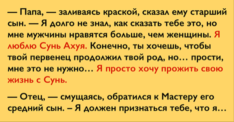 Мастер Ван уже был готов высказаться своим детям, но внезапно в его голове пронеслось: «А стоит ли запрещать им что-нибудь, учить жить и решать за них? Пусть делают, как хотят, главное – чтобы они были счастливы. Я же не дикарь, а толерантный современный человек».