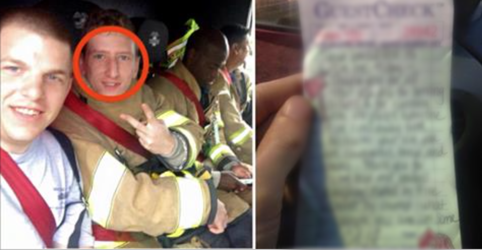 „Спасибо. Ваш завтрак сегодня на мне, спасибо за все, что вы делаете; за служение другим и за то, что стремитесь бежать туда, откуда бегут все остальные. Не важно, что вами движет, вы бесстрашны, храбры и сильны…Спасибо, что вы решительные и дерзкие каждый день! Разогретые огнем и ведомые смелостью, вы являетесь примером для других! Отдыхайте! ? Лиз“.