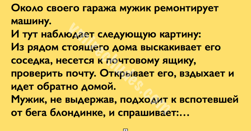 Мужику стало не на шутку смешно и интересно. И он, уже не залезая под капот машины, ждет, когда соседка опять выбежит из дома. Ждать долго не пришлось. Через пару минут картина с почтовым ящиком снова повторяется.