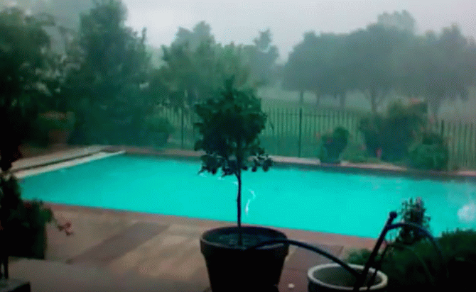Это была поздняя весна в Оклахома-Сити (США). Автор видео и его семья наблюдали ужасный шторм, бушующий за окном. Можно только представить, какие эмоции они пережили, когда небо резко потемнело, поднялся сильный ветер и на землю полетел град размером с бейсбольный мяч. Град так резко начал падать, что бассейн в их дворе буквально забурлил.
