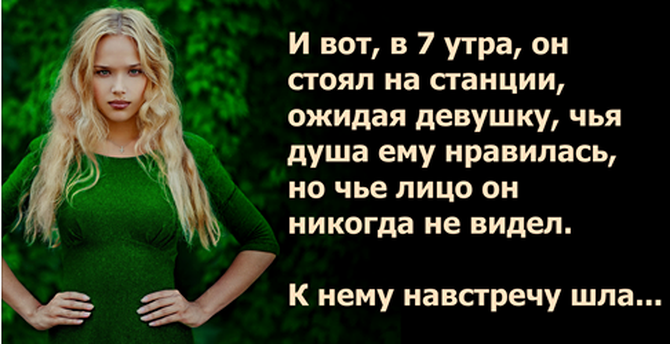 И вот, в 7 утра, он стоял на станции, ожидая девушку, чья душа ему нравилась, но чье лицо он никогда не видел. К нему навстречу шла молодая женщина со стройной, красивой фигурой. Ее лицо обрамляли длинные светлые локоны, а глаза были голубыми, как нежные цветы. В своем бледно-зеленом костюме она выглядела, как только что пробудившаяся весна. Он направился к ней, совершенно забыв посмотреть, есть ли у нее роза.