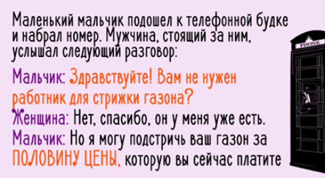 Мальчик: Но я могу подстричь ваш газон за половину цены, которую вы сейчас платите своему работнику!