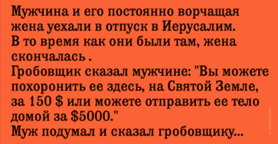 Мужчина и его постоянно ворчащая жена уехали в отпуск в Иерусалим . В то время как они были там, жена скончалась .