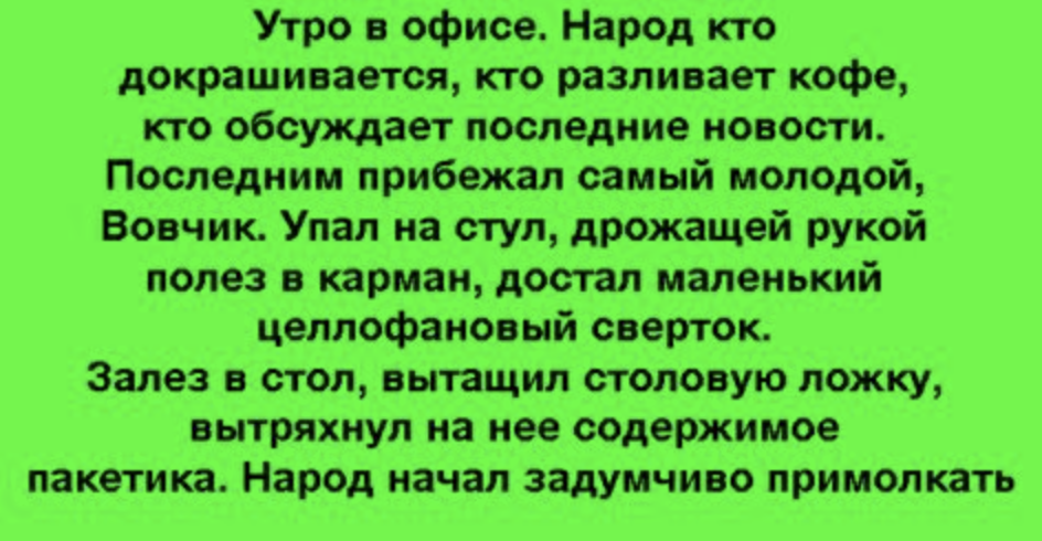 Утро в офисе. Народ кто докрашивается, кто разливает кофе, кто обсуждает последние новости. Последним прибежал самый молодой, Вовчик. Упал на стул, дрожащей рукой полез в карман, достал маленький целлофановый сверток. Залез в стол, вытащил столовую ложку, вытряхнул на нее содержимое пакетика. Народ начал задумчиво примолкать и коситься на Вовчика.