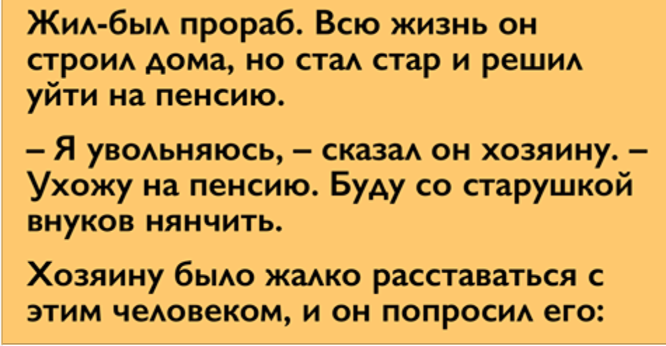 Жил-был прораб. Всю жизнь он строил дома, но стал стар и решил уйти на пенсию.